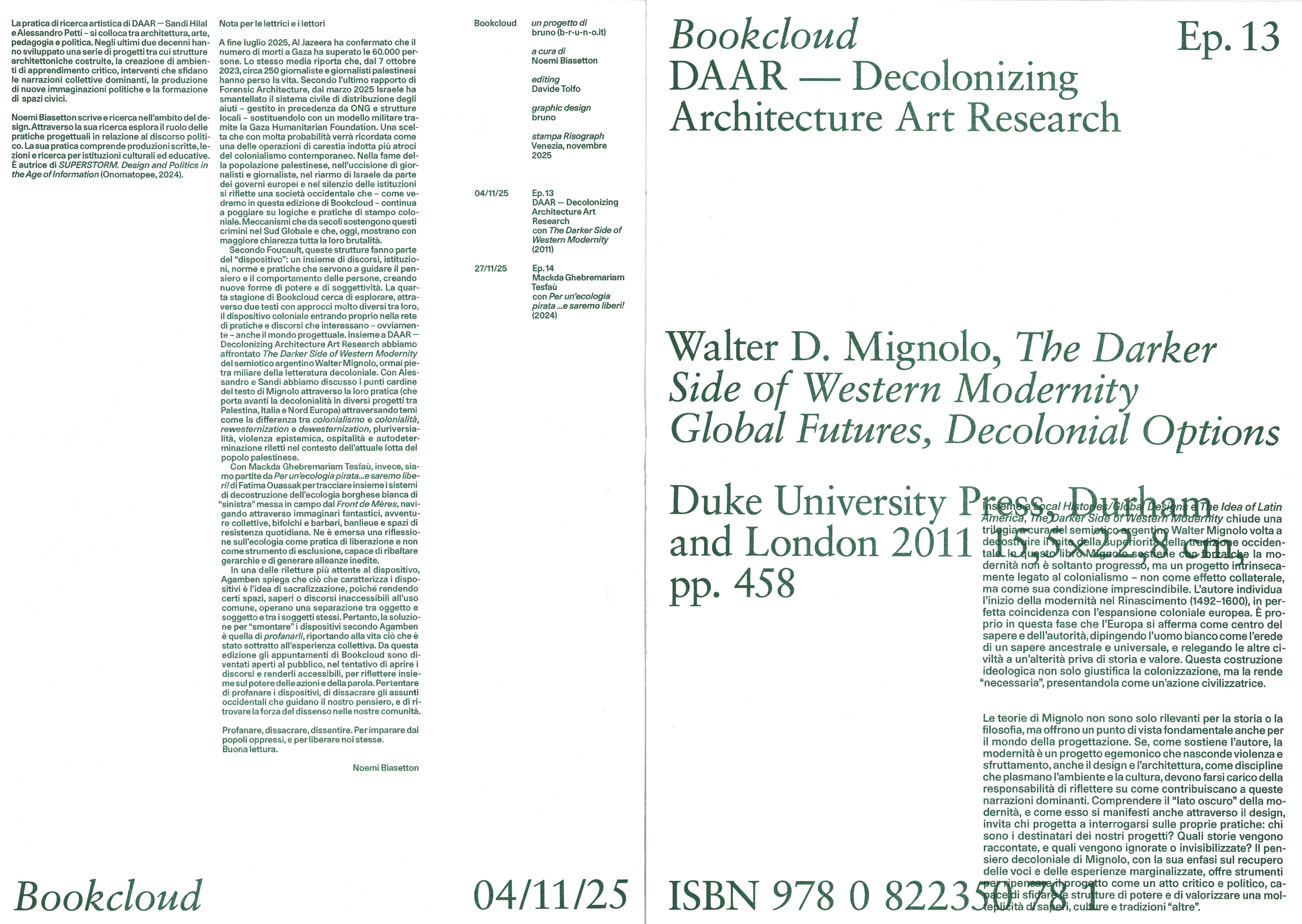 The fourth edition of Bookcloud investigates the colonial dispositif as a network of practices, discourses, and epistemologies that continue to shape Western modernity. Starting from the ongoing genocide in Gaza, the silencing of journalists, and the militarization of humanitarian aid, this edition situates contemporary violence within longer histories of coloniality embedded in Western knowledge systems. Drawing on Michel Foucault’s notion of the dispositif, this edition of Bookcloud explores how power operates through design, institutions, and imaginaries to produce subjectivities and exclusions. Through a dialogue with DAAR on Walter Mignolo’s The Darker Side of Western Modernity, themes such as decoloniality, epistemic violence, pluriversality, and self-determination are examined in relation to Palestine. A second contribution, inspired by Fatima Ouassak and discussed with Mackda Ghebremariam Tesfaù, reframes ecology as a collective practice of liberation rather than exclusion.