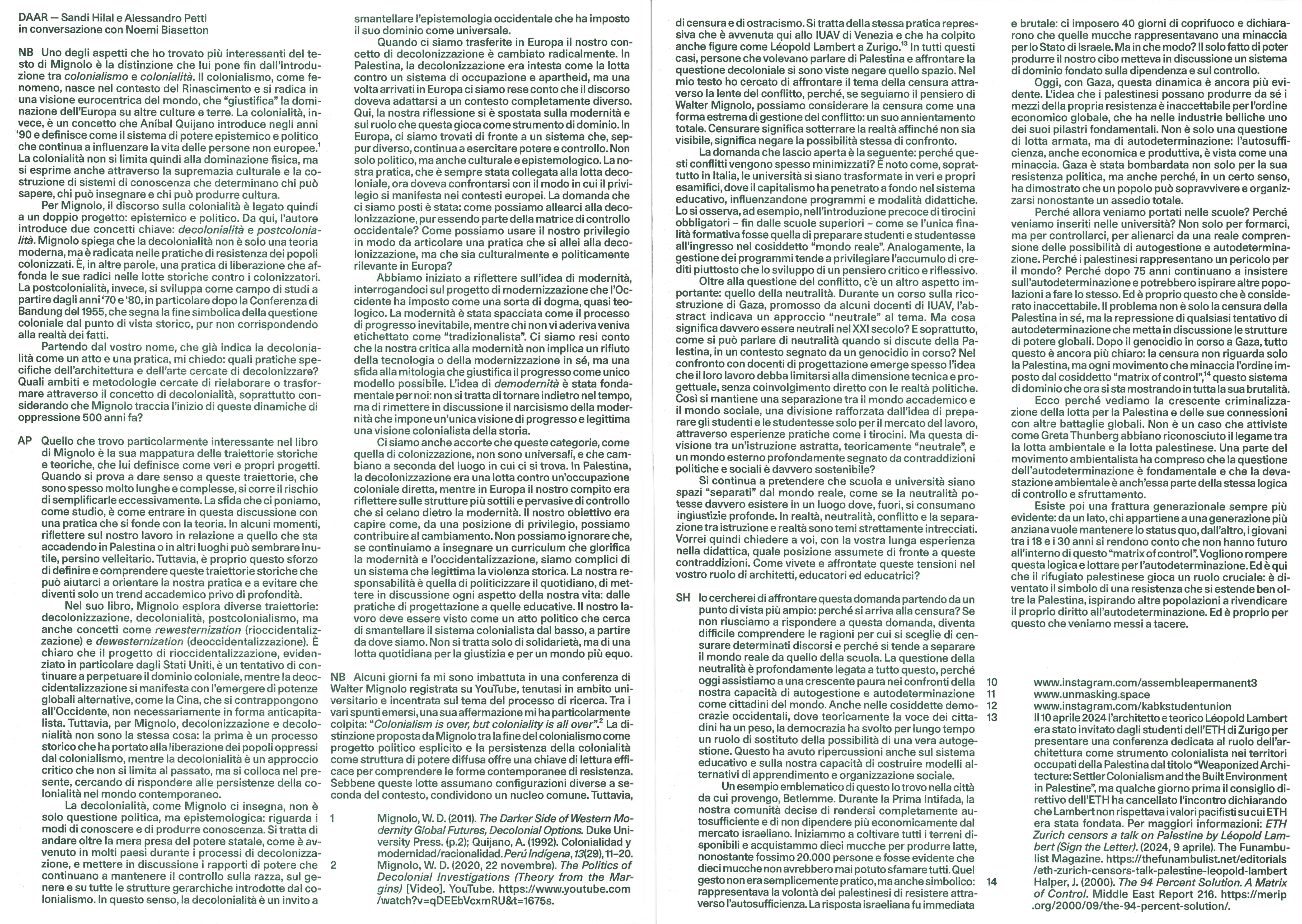 The article explores the recent surge of pro-Palestinian activism within European design and architecture universities, focusing on student-led initiatives at ETH Zurich, IUAV Venice, and KABK The Hague. Sparked by Israel's military actions in Gaza and inspired by similar protests in the United States, students have increasingly challenged their institutions political neutrality and complicity in global injustices. From cancelled lectures and censored events to sustained sit-ins and successful policy changes, the piece traces how student movements have exposed tensions between academic freedom, political risk management, and the ethical responsibilities of higher education. Through interviews with students and activists, the article highlights the growing disillusionment with how 'decolonization' is framed within design education - as a theoretical gesture rather than a commitment to material change. The text critiques universities' reluctance to address settler colonialism in Palestine, illustrating how institutions often retreat into neutrality that effectively silences dissent. Ultimately, it positions design schools as crucial sites for confronting power, fostering critical discourse, and reimagining what education can be in times of conflict.