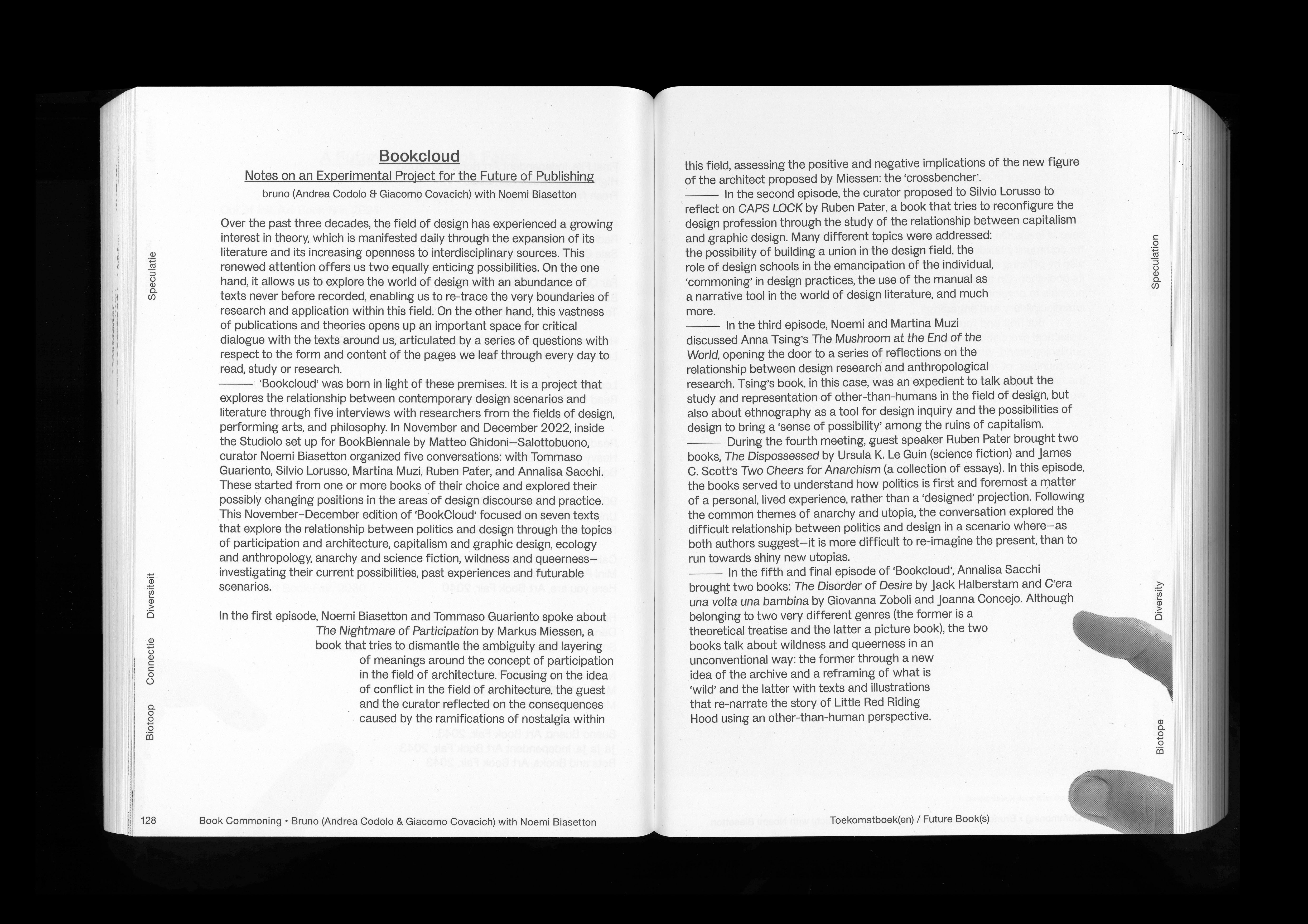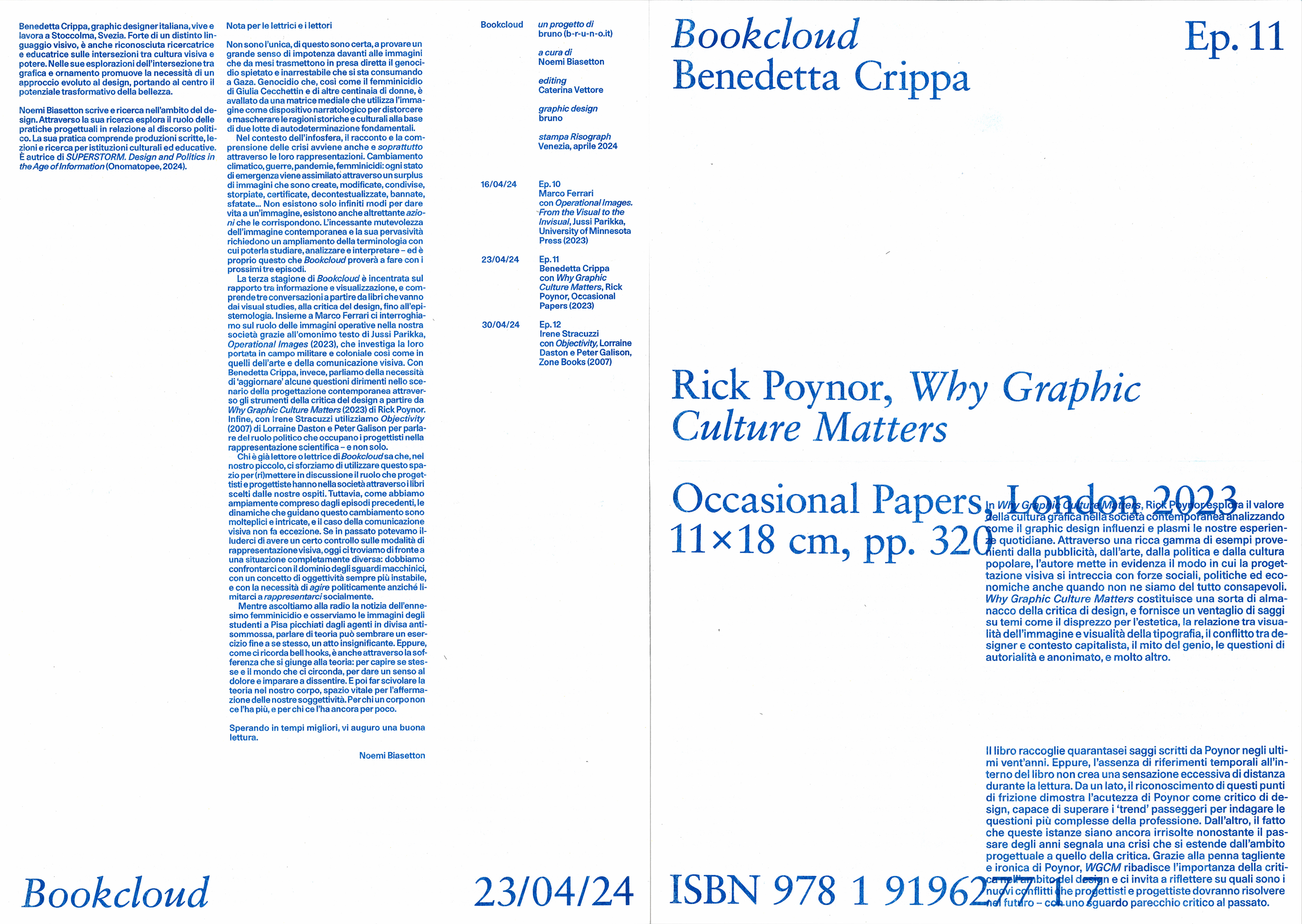 Noemi Biasetton is a design researcher, writer and editor based in Venice. Her academic studies focus on design cultures and visual representation, with a specific interest in how these are deployed within the social and political dimension. Her practice includes the production of essays and articles, the organization of talks and lectures, and the contribution to research projects for cultural and educational institutions. She is the author of SUPERSTORM. Design and Politics in the Age of Information (Onomatopee, 2024) and curator of the publishing series Bookcloud (bruno, 2022 – ongoing).
