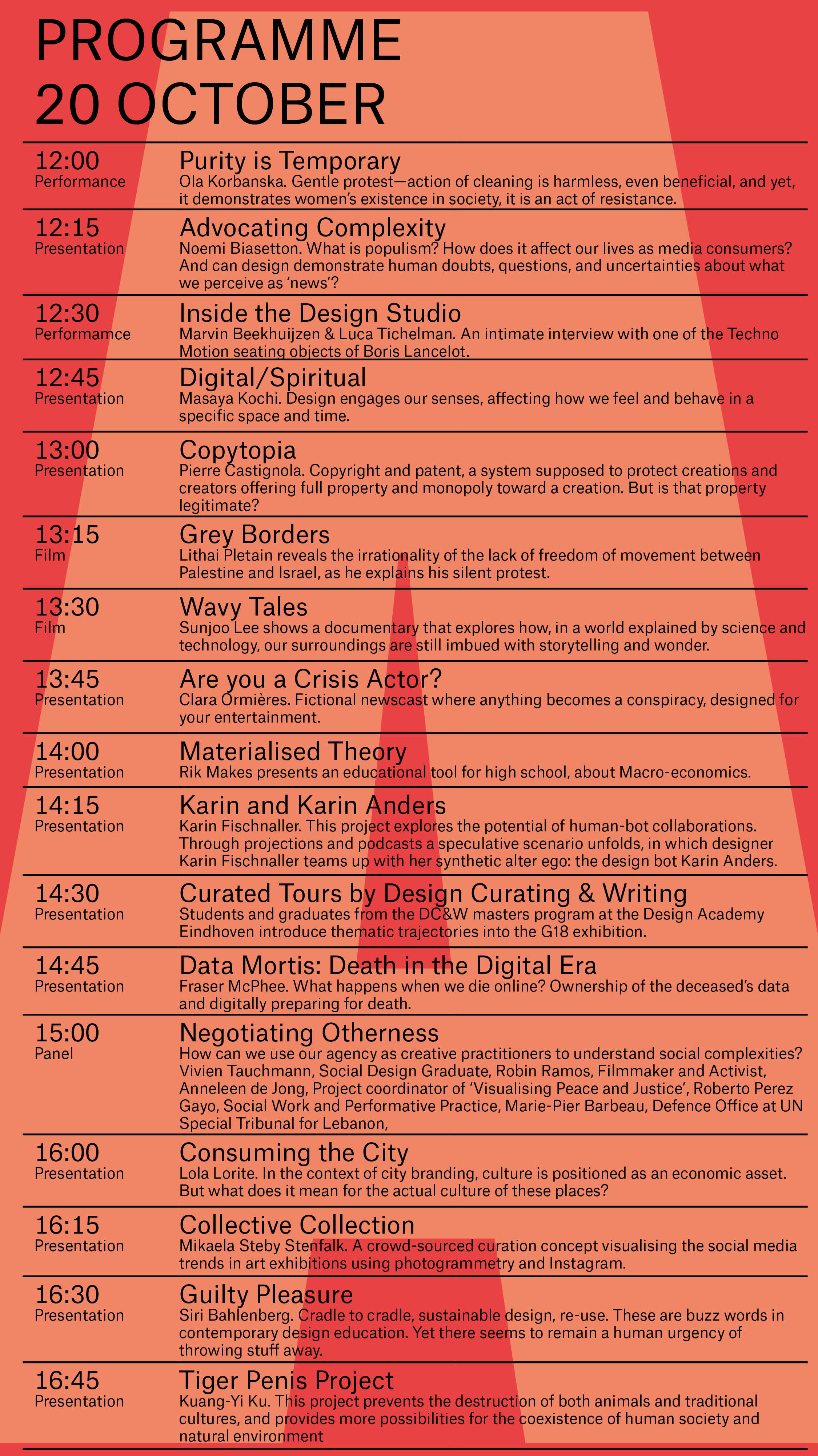The panel 'Design and Populism' sprouted from the graduation project of Information Design graduate Noemi Biasetton’s thesis Advocating Complexity. Throughout the panel Andrew Stroehlein European Media Director from the NGO Human Rights Watch mentioned his joy in seeing people in different countries standing up for free speech and human rights. Clara Balaguer from Hardworking Goodlooking introduced the idea of changing the designer role from a modernist thinker to an active listener. Instead of opposing order, they should absorb the chaos. Graphic designer and author Ruben Pater tied in and urged designers to get of the 'high horse' and acknowledge that design can be patronising when it shouldn’t be. When the conversation led further into social media, political researcher Kristof Jacobs brought to attention the fundamental role of the designers: the pure construction of the algorithm facebook uses makes it a sphere of polarisation because it rewards it. If you change the algorithm, you can change the nature of social media.