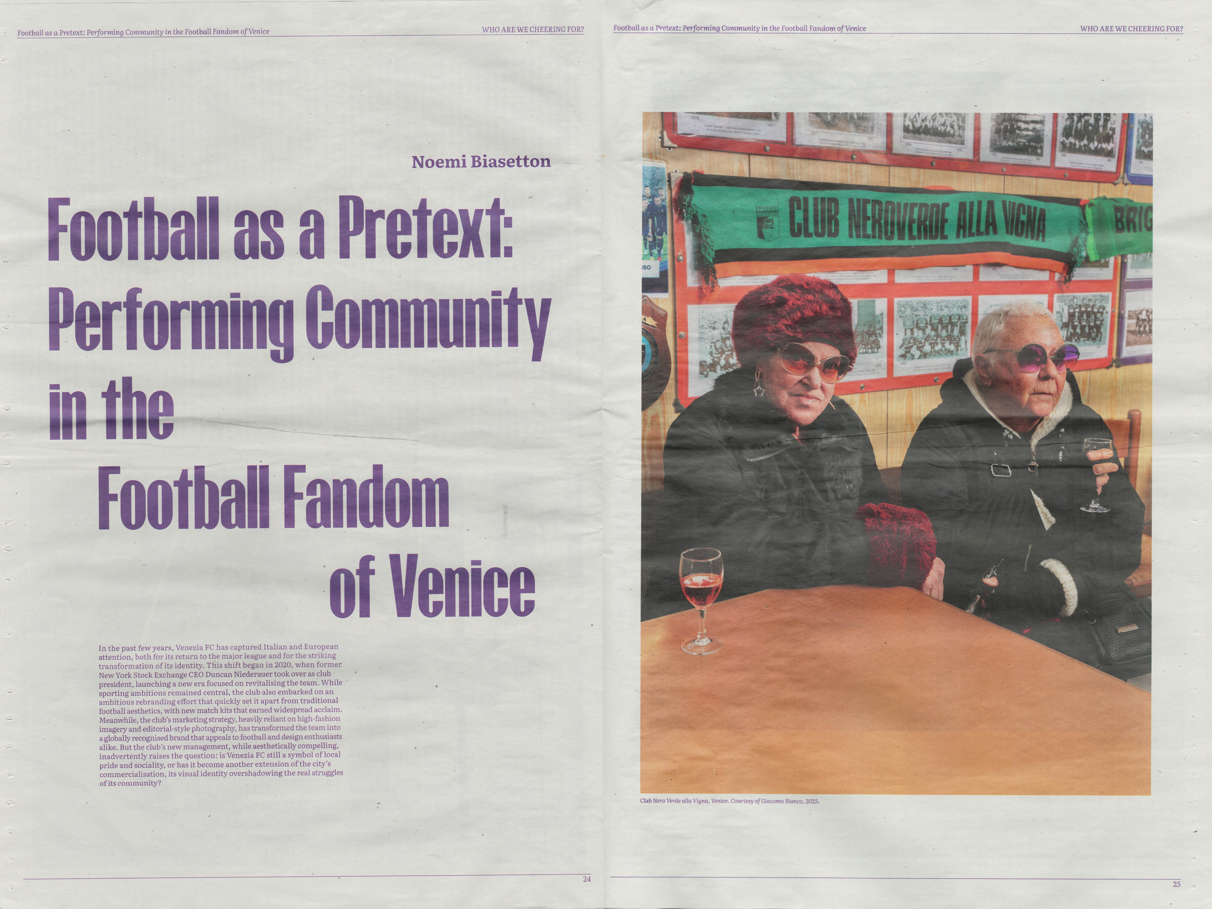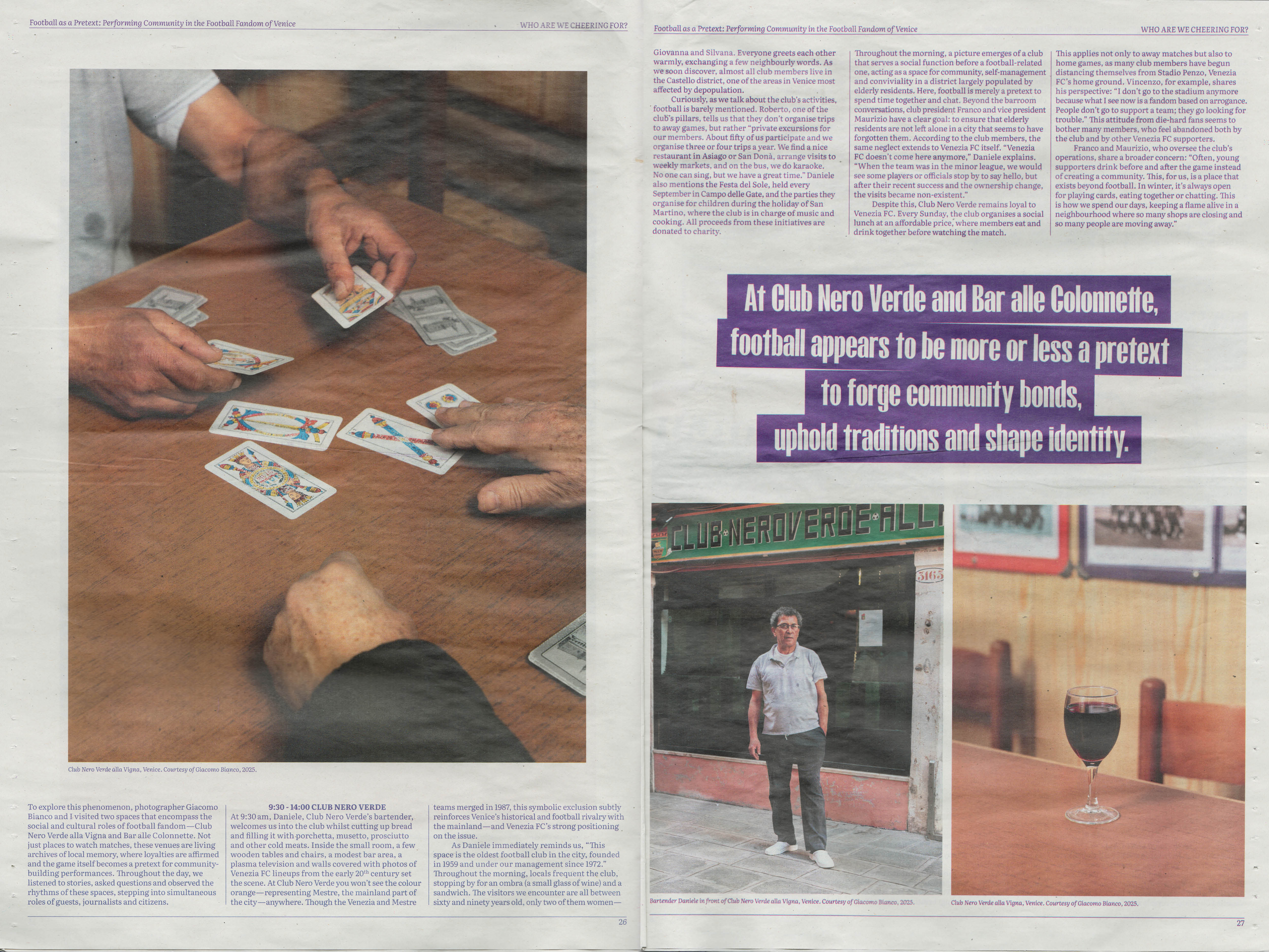 The article Football as a Pretext: Performing Community in the Football Fandom of Venice explores the role of football clubs in Venice and their acts of community-making through interviews and photographs, questioning how these spaces and their inhabitants respond to the increasing spectacularization of the city and its football club.