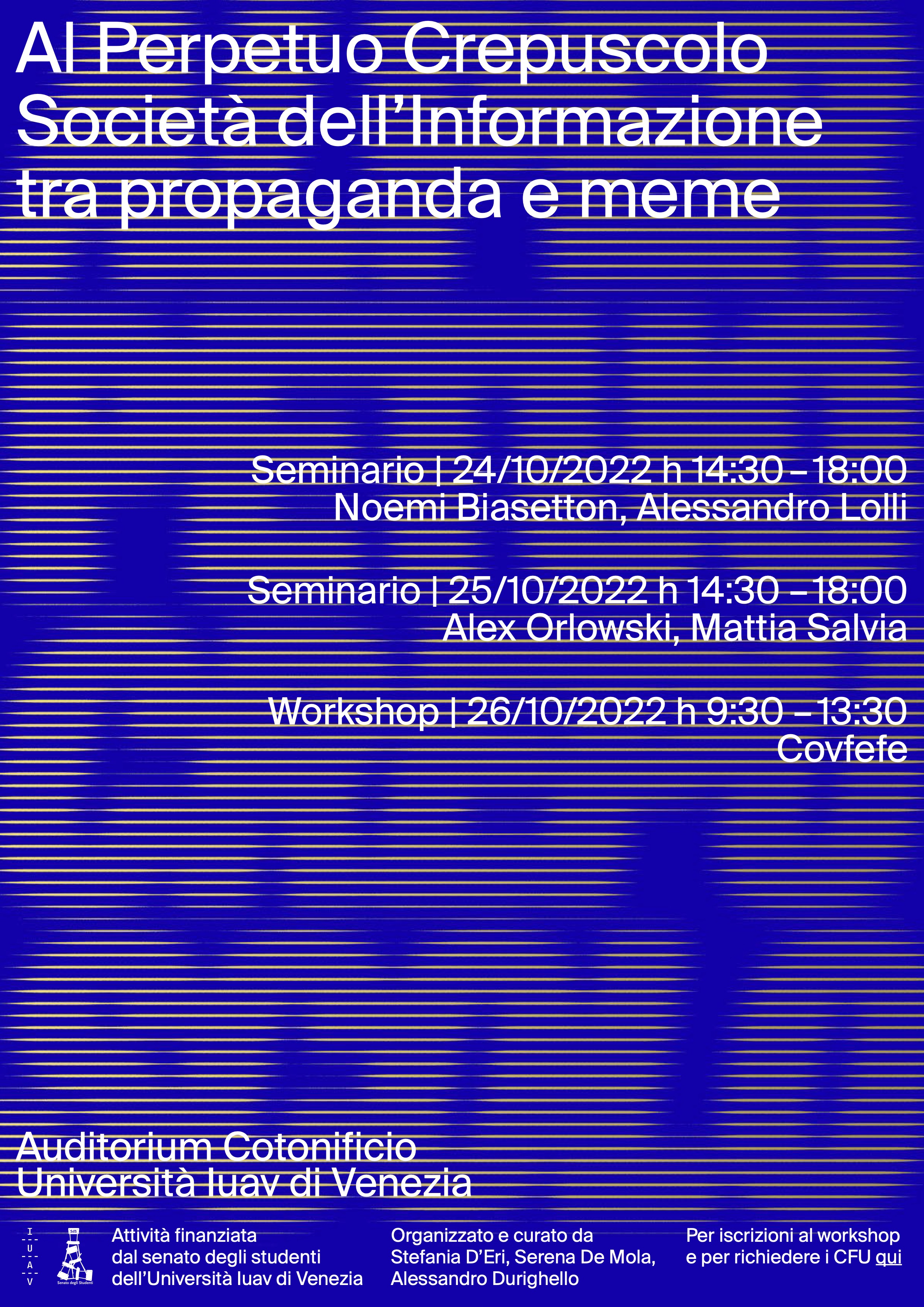 Al perpetuo Crepuscolo | Società dell’Informazione tra propaganda e meme consiste in due giornate seminariali per discutere gli effetti che i nuovi media e le loro logiche hanno avuto sul mondo della politica e, più in generale, il rapporto tra estetica e politica nella società dell’informazione.